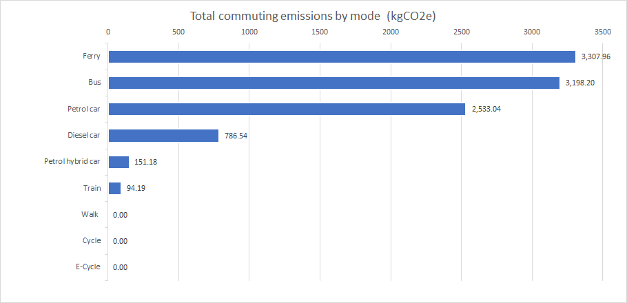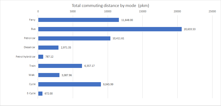 Each mode of transport has a different emission factor. This figure represents the amount of greenhouse gas produced to transport a person one kilometre. Interestingly, the transport modes that clocked up the biggest distances were not always the largest sources of our commuting emissions. Bus transport is a good example.