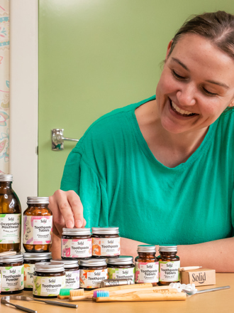 Solid produces toothpaste in tablet and powder forms, packaged in returnable glass jars, to reduce plastic waste. It has saved 150,000 toothpaste tubes from landfill.